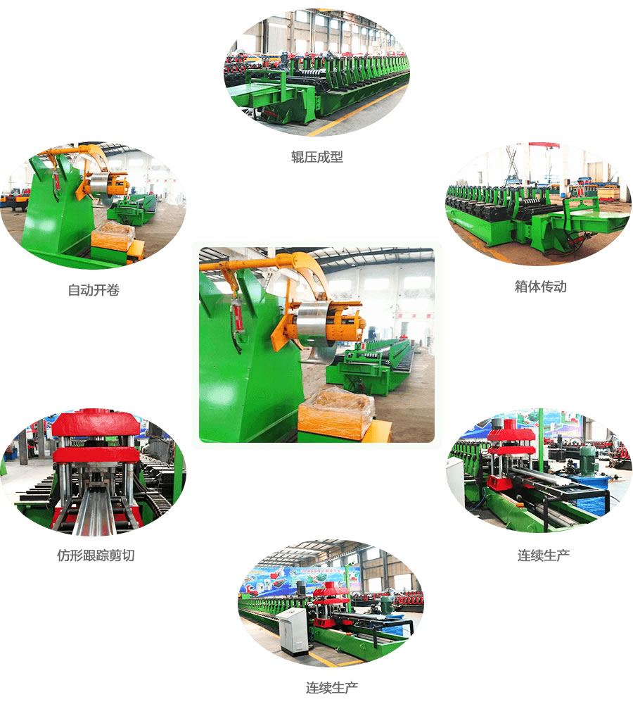 工藝流程: 液壓自動開卷→引料裝置→校平→輥壓成型→機(jī)械跟蹤沖孔切斷→托料出板