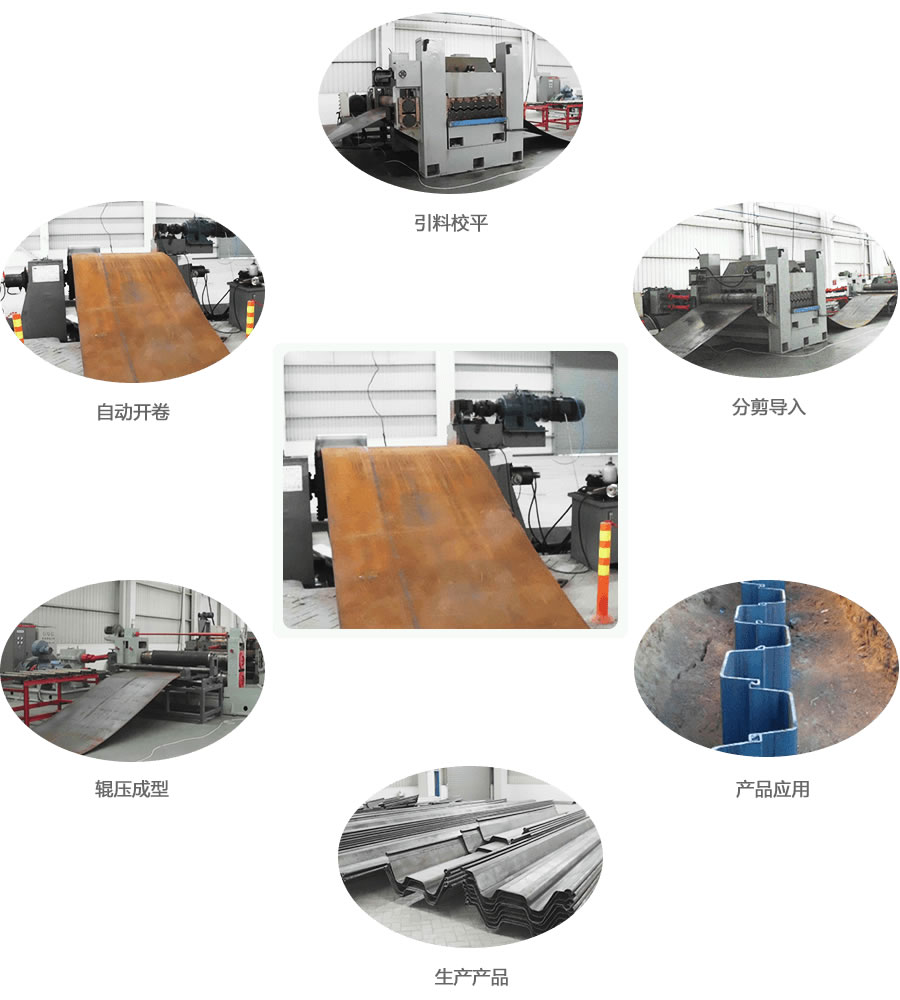 工藝流程: 開卷—引料校平—分剪對(duì)焊—輥壓成型—仿型切割—堆垛
