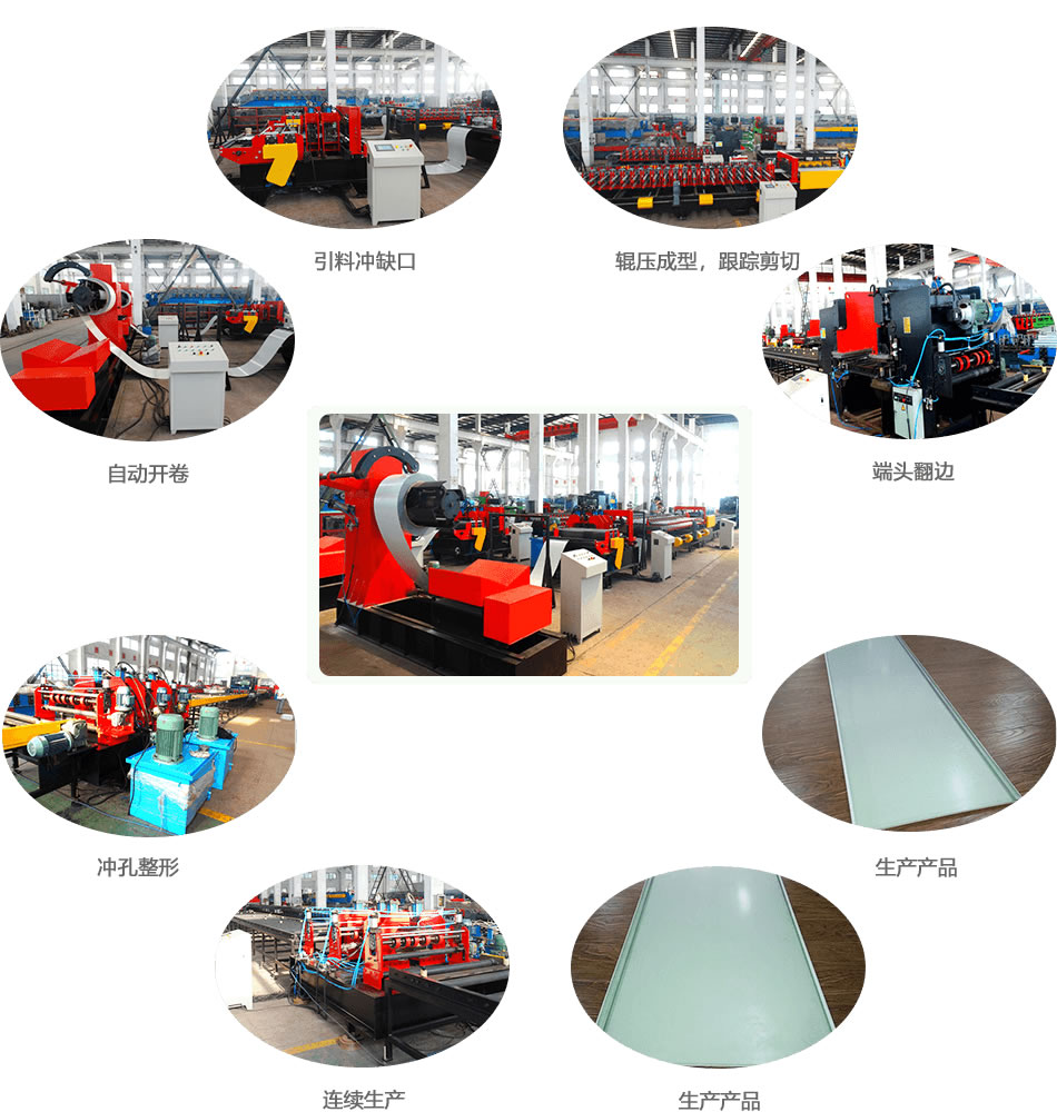 工藝流程: 自動開卷→引料、沖缺口,剪切→輥壓成型、跟蹤切斷→動力輸送→前后端翻邊→沖孔整形