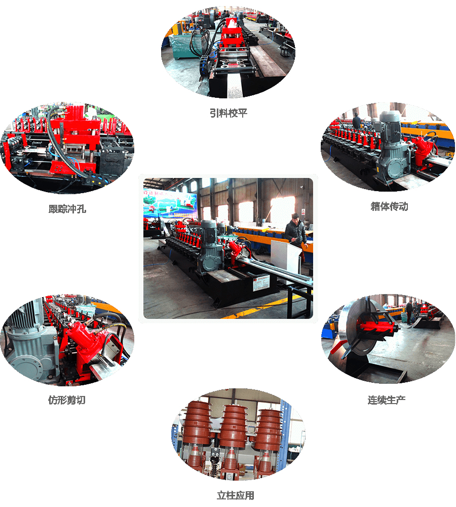 工藝流程: 開卷→整平→機械跟蹤沖孔→輥壓成型→切斷翻邊→出料