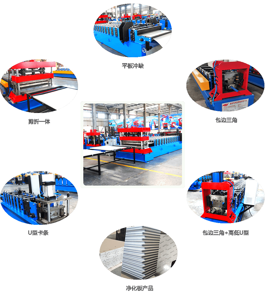 工藝流程: 開卷→引料覆膜→平板沖缺口→輥壓成型→切斷翻邊→出料